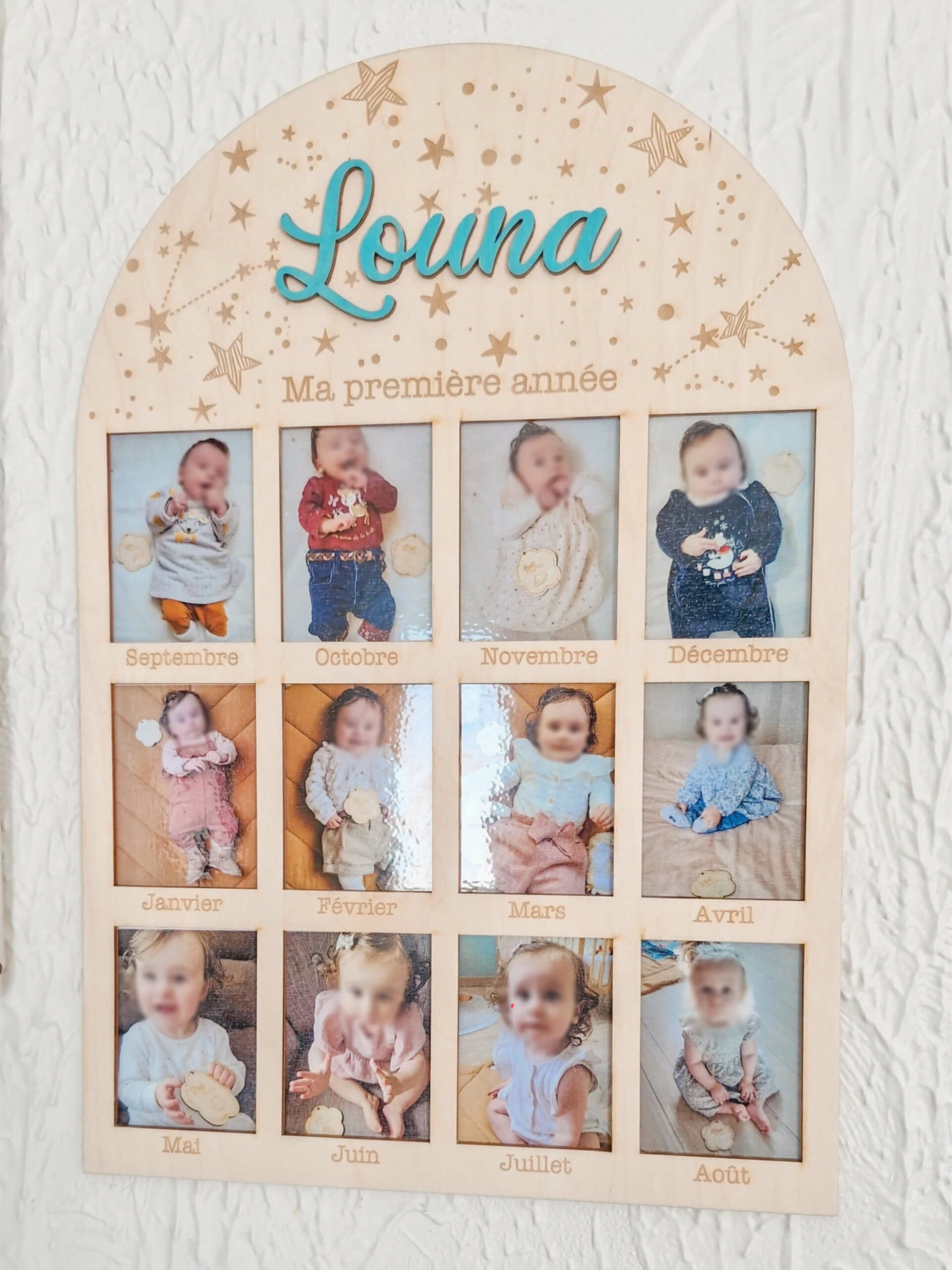 Exposez chaque mois précieux de la première année de votre bébé avec ce Tableau Photos en Bois. Présentant 12 compartiments pour vos photos, ce tableau est entièrement personnalisable avec le prénom de votre enfant et le thème de votre choix. Idéal comme cadeau émouvant pour un souvenir durable et unique.