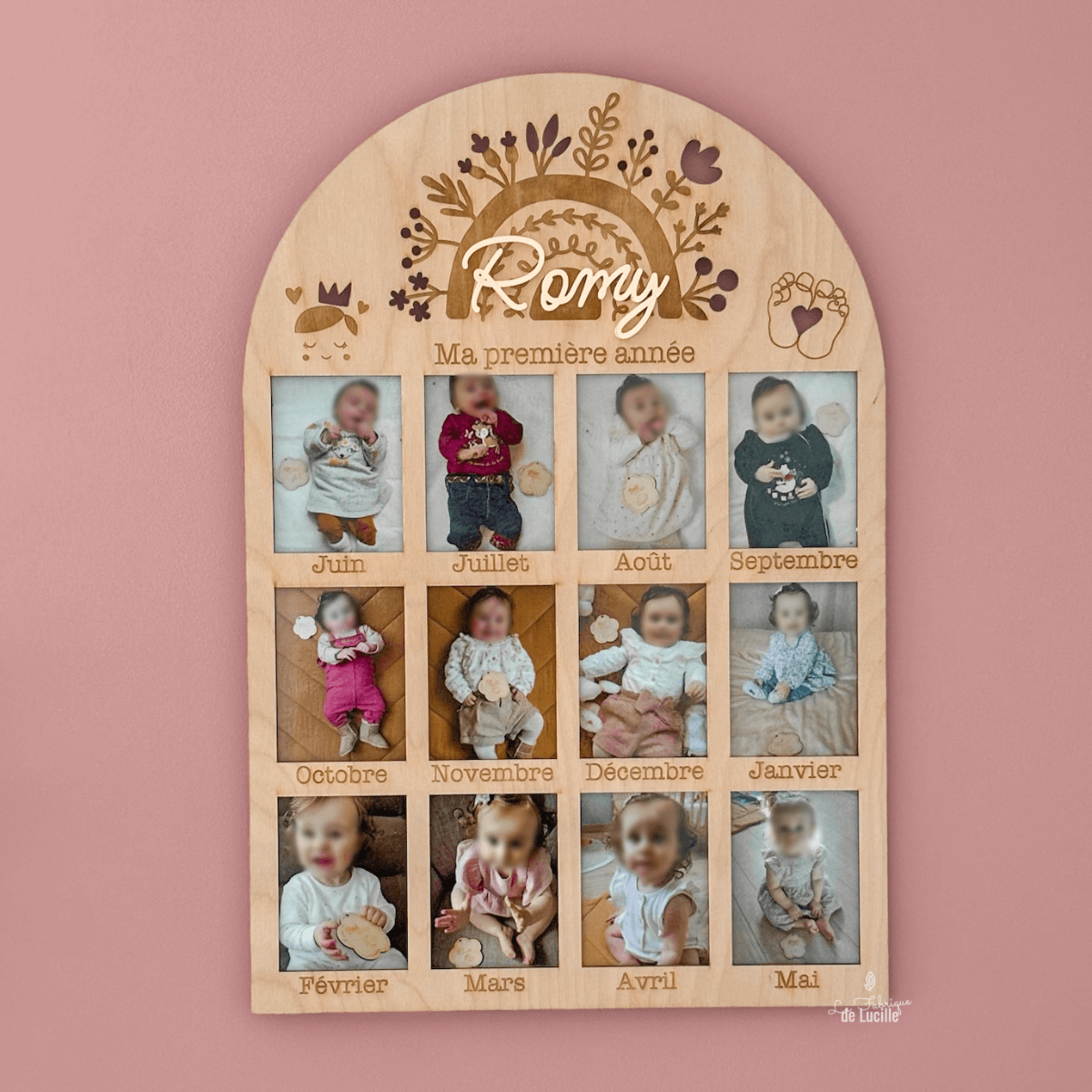 Exposez chaque mois précieux de la première année de votre bébé avec ce Tableau Photos en Bois. Présentant 12 compartiments pour vos photos, ce tableau est entièrement personnalisable avec le prénom de votre enfant et le thème de votre choix. Idéal comme cadeau émouvant pour un souvenir durable et unique.