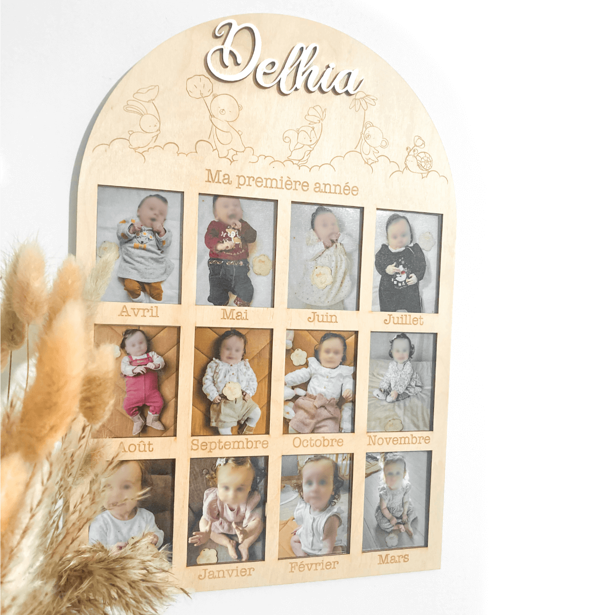 Exposez chaque mois précieux de la première année de votre bébé avec ce Tableau Photos en Bois. Présentant 12 compartiments pour vos photos, ce tableau est entièrement personnalisable avec le prénom de votre enfant et le thème de votre choix. Idéal comme cadeau émouvant pour un souvenir durable et unique.