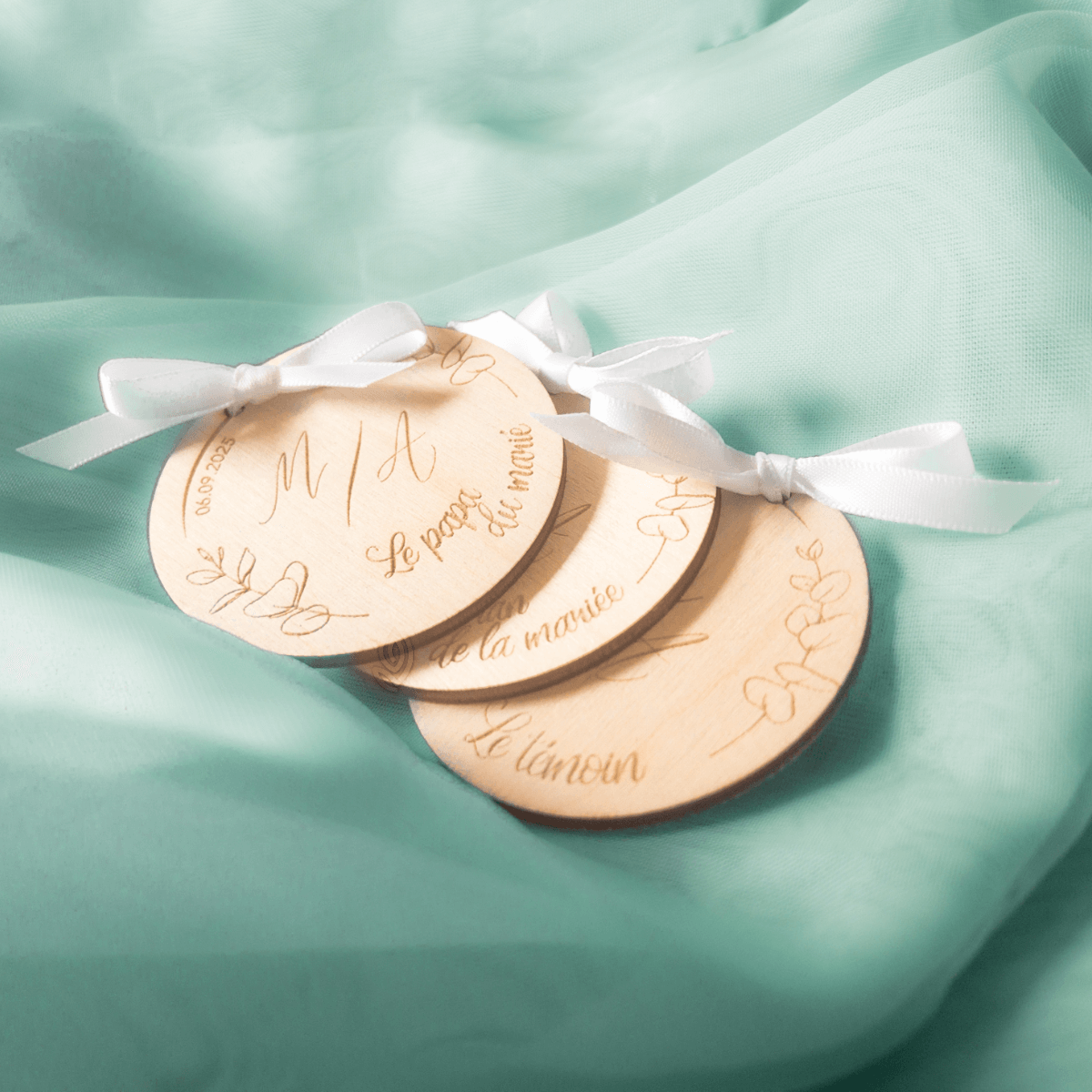 Idéal pour les mariages, ces macarons en bois gravés sont parfaits pour identifier les tenues des mariés, des témoins et des autres membres importants de la cérémonie. Accrochez-les aux cintres pour une organisation sans faille et une touche décorative supplémentaire.